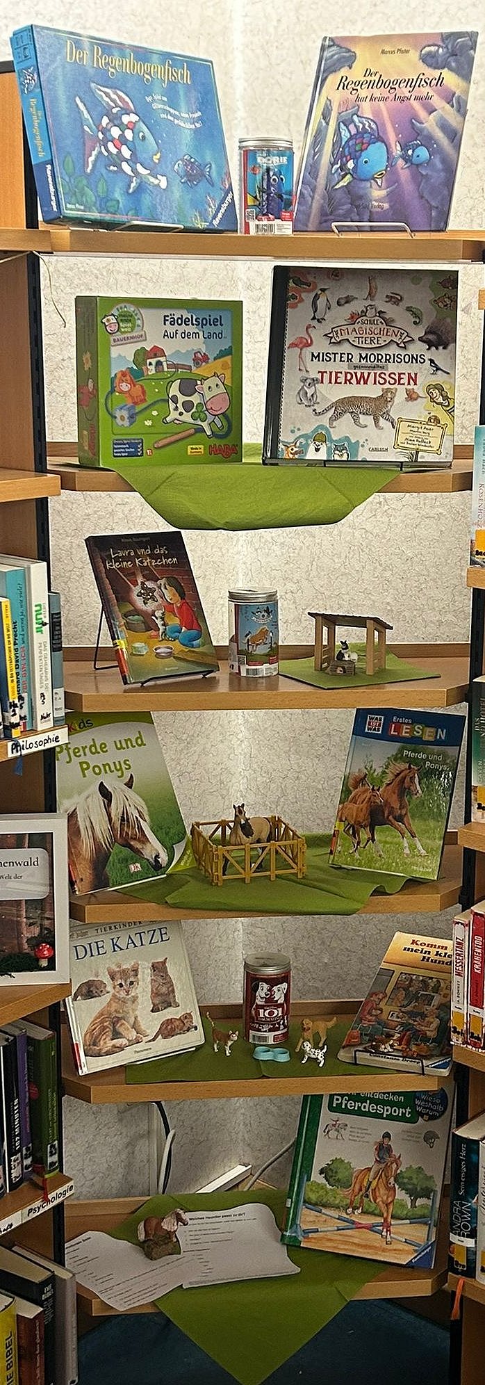 Eine bunte Auswahl an Büchern lädt zum Schmökern, Staunen und Vorlesen ein, und mit den Tonies können spannende Tiergeschichten auch gehört werden.