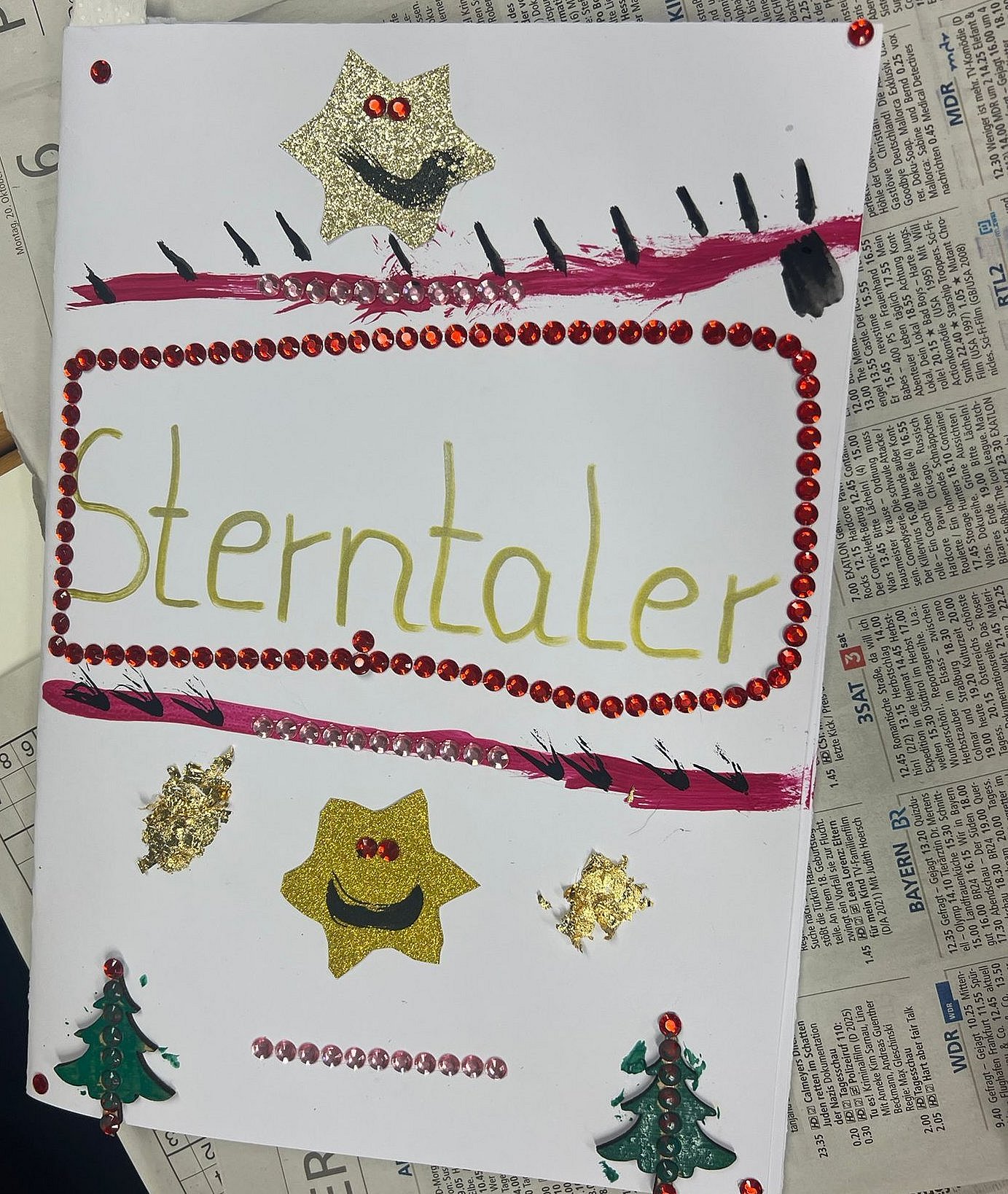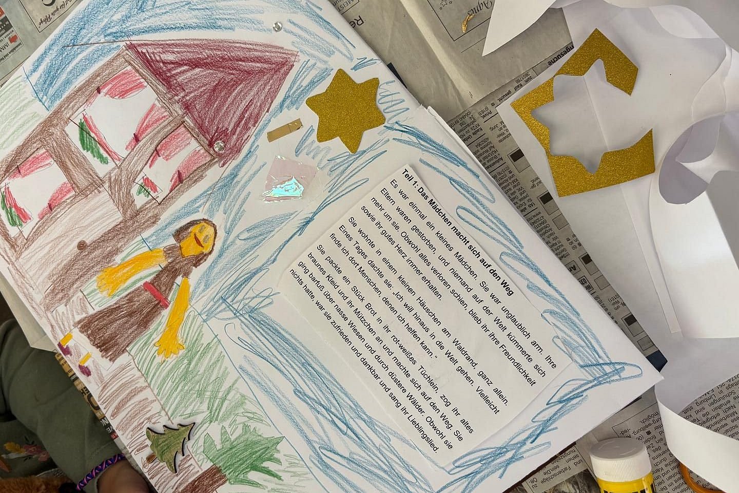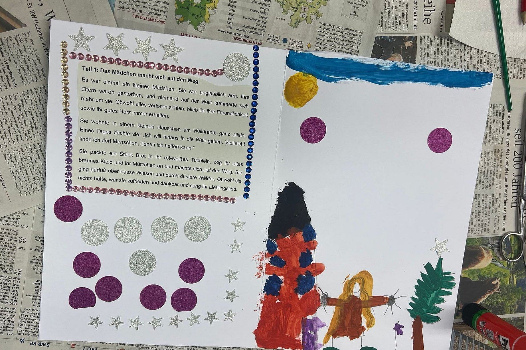 In einer fröhlichen Atmosphäre gestalteten die jungen Teilnehmerinnen und Teilnehmer ihre ganz eigenen Märchenbücher – inspiriert vom beliebten Grimm-Märchen „Sterntaler“. Es wurde eifrig gemalt, geklebt und natürlich reichlich mit Sternen und Glitzer verziert.